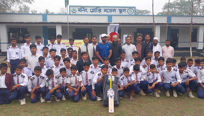 ক্রিকেট সামগ্রী নিয়ে খুদে শিক্ষার্থীদের পাশে ক্রিকেটার জাভেদ ওমর ও মিজান