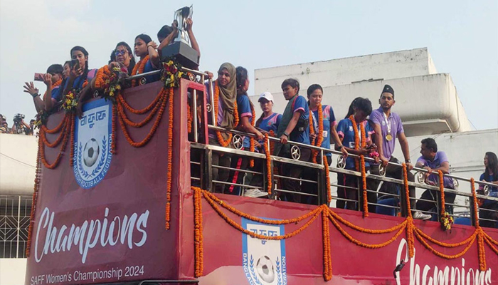 ছাদখোলা বাসে চড়ে বাফুফের পথে সাফ চ্যাম্পিয়নরা